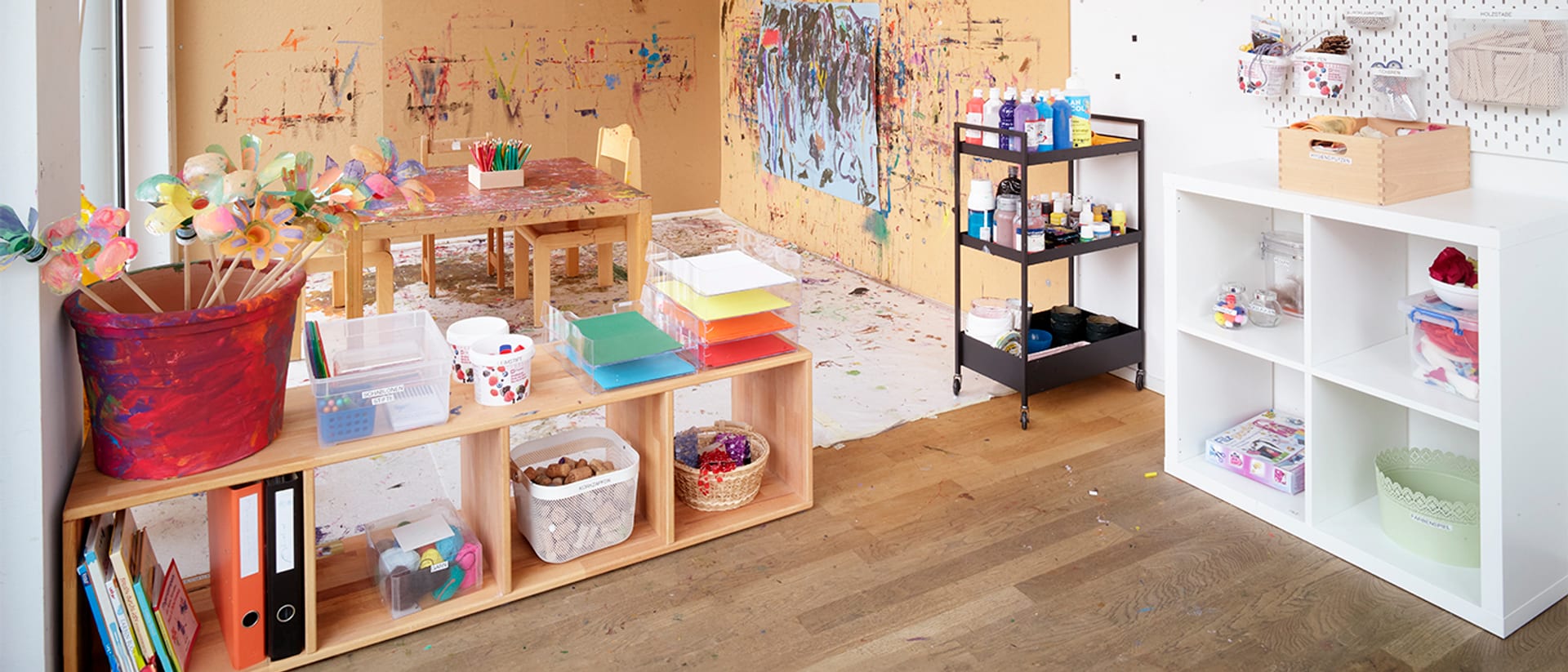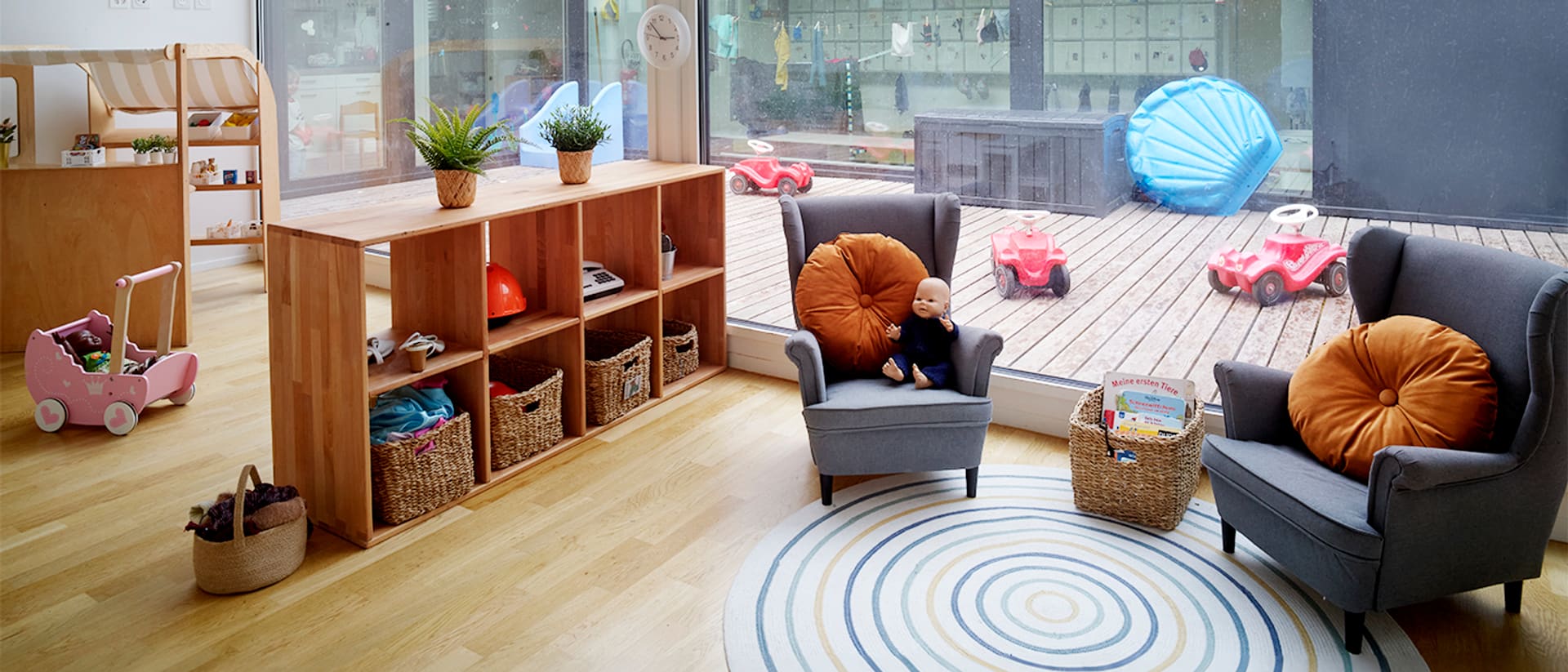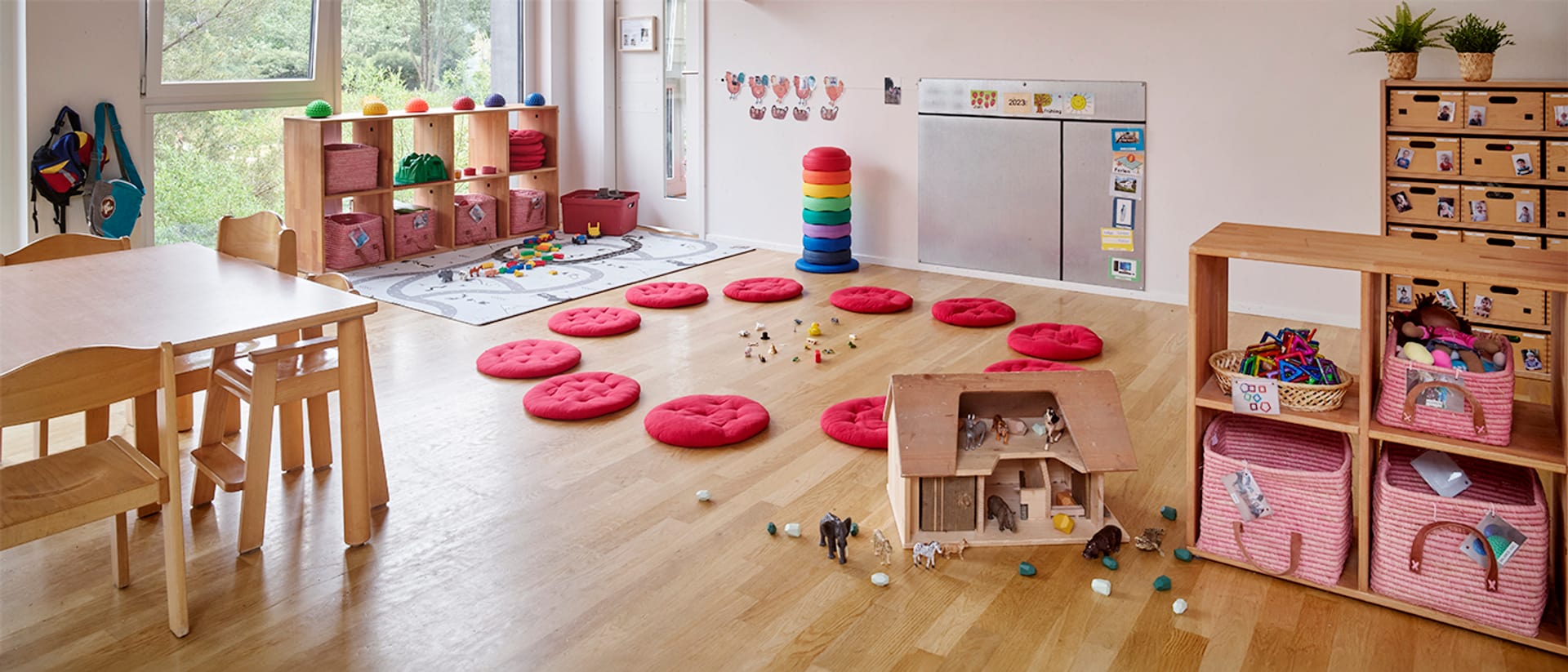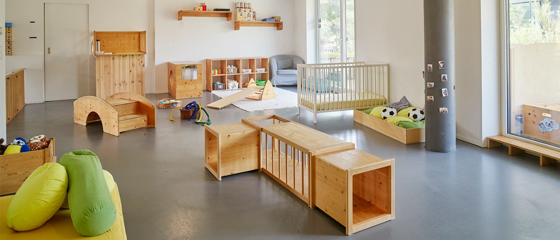 Die vier Altersgruppen der Kita Rappard wurden nach Farben benannt, schliesslich hat die Kita – wie der Quartierplatz vor dem Haus – eine berühmte Namensgeberin: Die Berner Malerin Clara von Rappard (1857-1912). Das moderne Gebäude am Rappardplatz in Bern wurde 2008 gebaut und extra für eine Kita und einen Kindergarten konzipiert. Die grossen, bodenlangen Fenster bringen viel Licht in die Räume, schaffen Vertrauen und Transparenz. Es gibt viel Platz und grosszügige Zimmer, die nach dem Konzept der praxisorientierten Bildungsarbeit eingerichtet wurden. So gibt es ein Rollenspiel- und Theaterzimmer, ein Mal- und Bastelatelier, einen Bewegungs- und Musikraum sowie ein Bau- und Mathematikzimmer. Im ersten Stock lockt eine geschützte Terrasse zum Spielen, Baden und Bobbycarfahren. Rund ums Haus – gelegen zwischen den Sporthallen Weissenstein und den Vidmarhallen – befindet sich ein grosser Spielplatz, den sich die Kita und der hauseigene, öffentliche Kindergarten teilen.