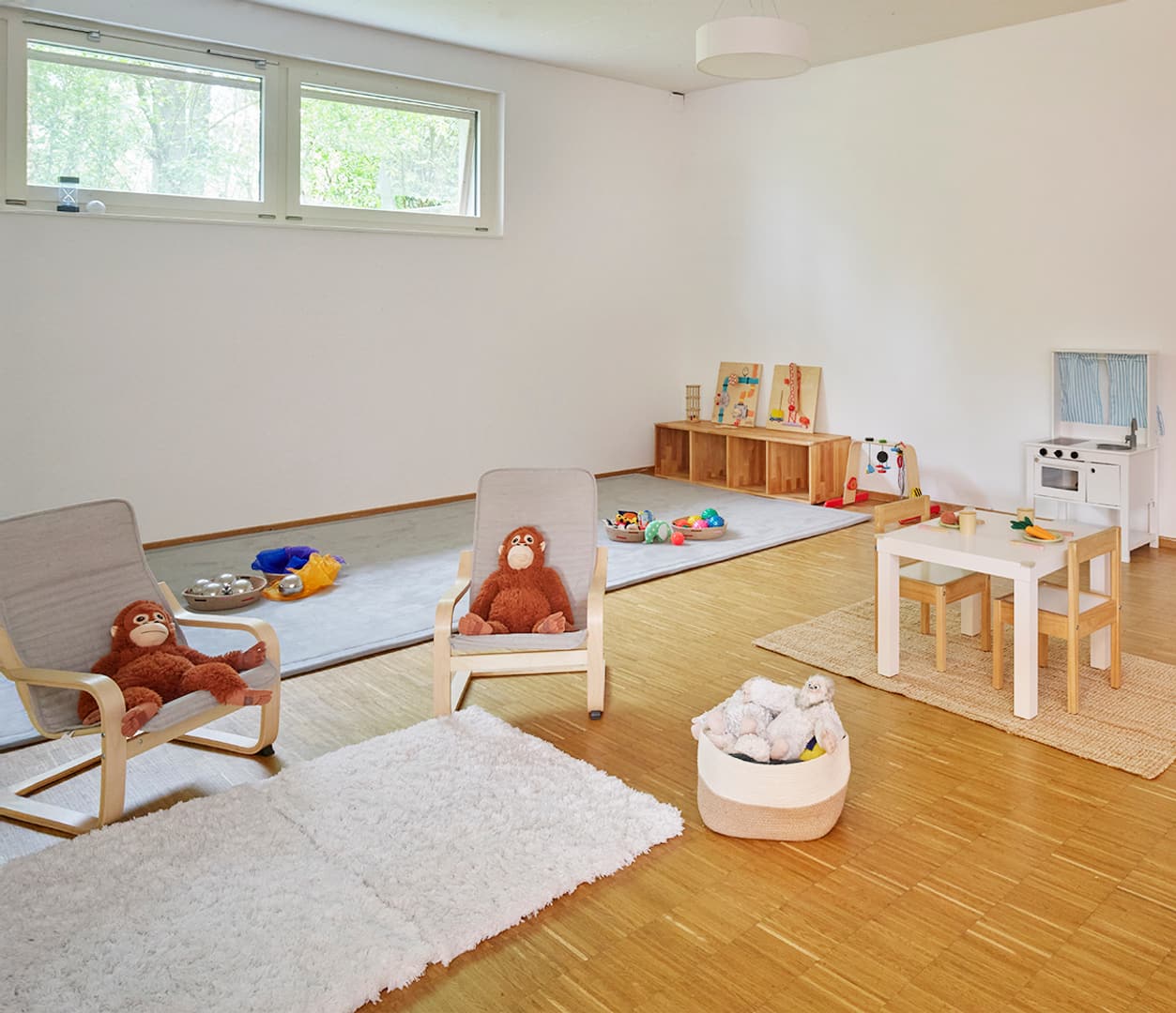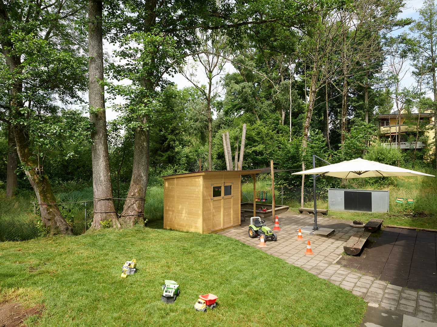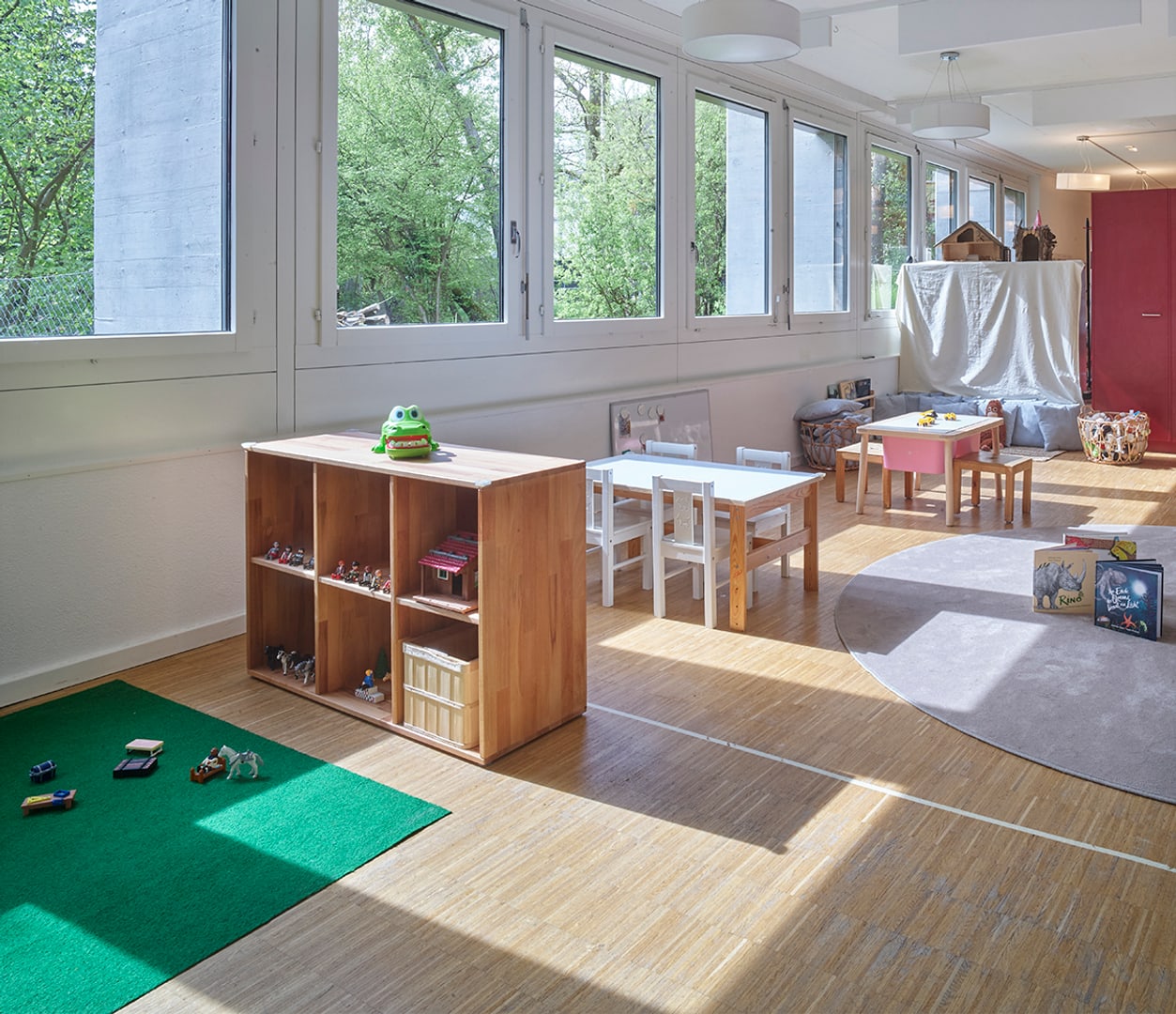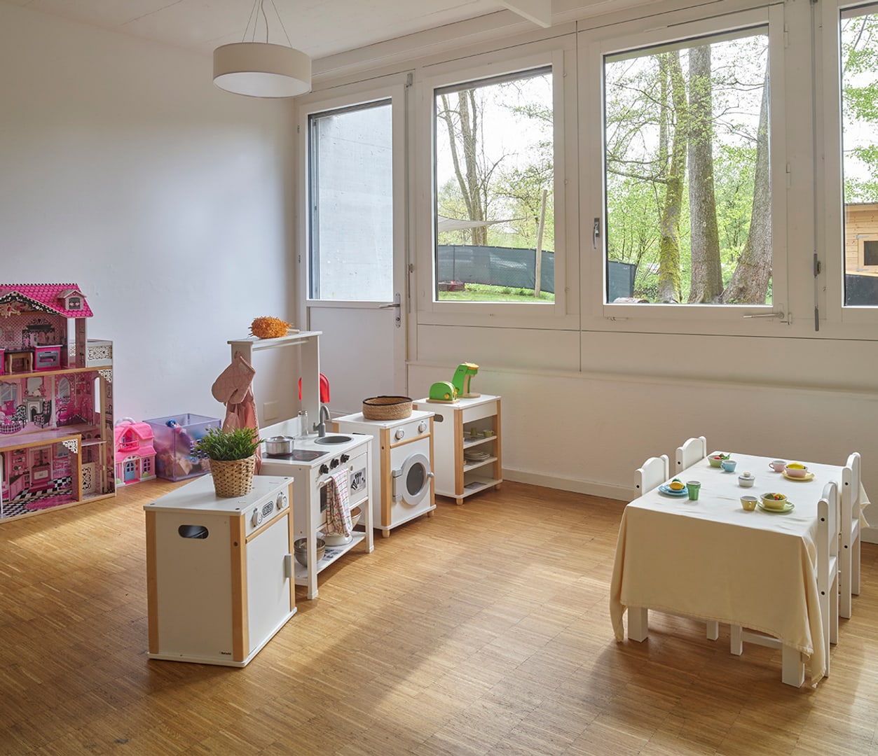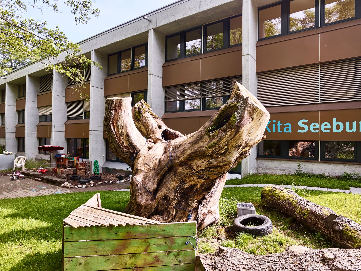 Die schöne rote Küche steht einladend mitten im grossen Kitaraum, wer will da nicht mithelfen? Die Kita Seeburg, direkt neben dem Verkehrshaus gelegen, ist vom Bahnhof Luzern in wenigen Minuten mit Bus oder Zug erreichbar. Die Kinder werden in zwei Altersgruppen betreut. Es gibt ein Bewegungszimmer und einen Schlafbereich, alles andere findet im grossen, offenen Raum statt. Hier stehen eine Rollenspielecke, eine Bücherwand, ein Siestabereich, eine Bauzone und eine Kreativecke zur Verfügung. Draussen wartet ein grosser, naturbelassener Garten. Die Kinder dürfen Äste sammeln oder im Boden Löcher graben, wie es ihnen gefällt. Ausserdem gibt es einen Fühlpfad. Regelmässig finden Ausflüge in den Würzenbachwald oder auf nahegelegene Spielplätze statt. Eine Besonderheit ist auch die Kulturvielfalt: Die Eltern der Kinder kommen aus der Schweiz, aus Japan, Amerika, Brasilien, Griechenland oder Italien. Deshalb wird jeden Monat ein neues Land der Erde thematisiert, wobei verschiedene Aktivtäten, passend zum Land, gemacht werden. Es wird mal italienisch gekocht, mal brasilianische Musik gehört oder griechisch getanzt.