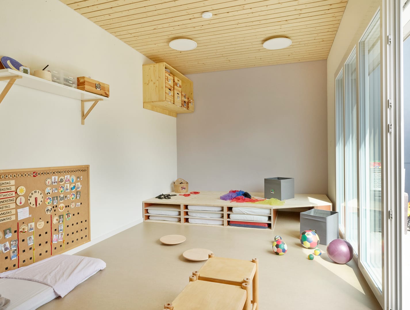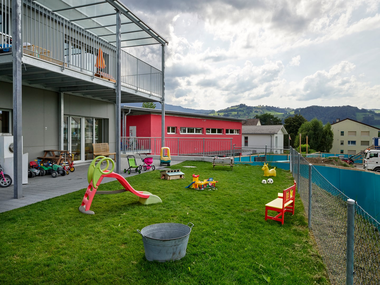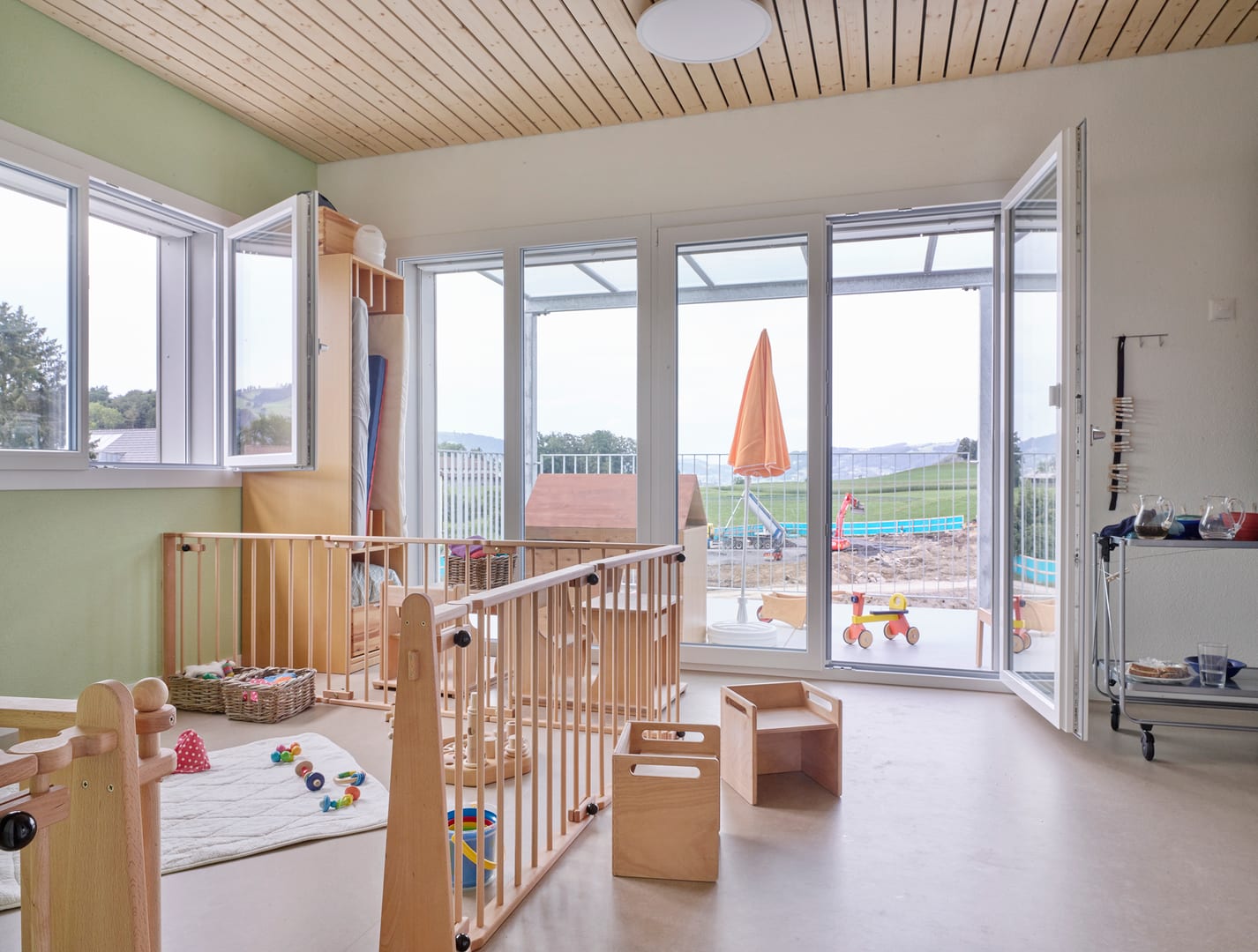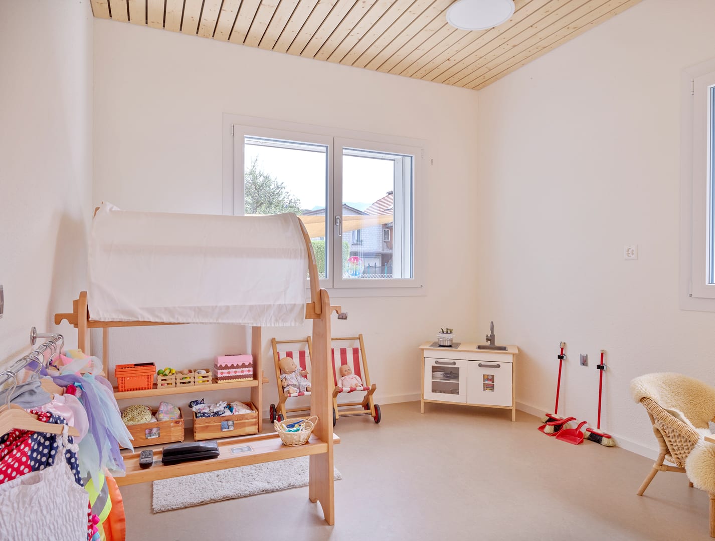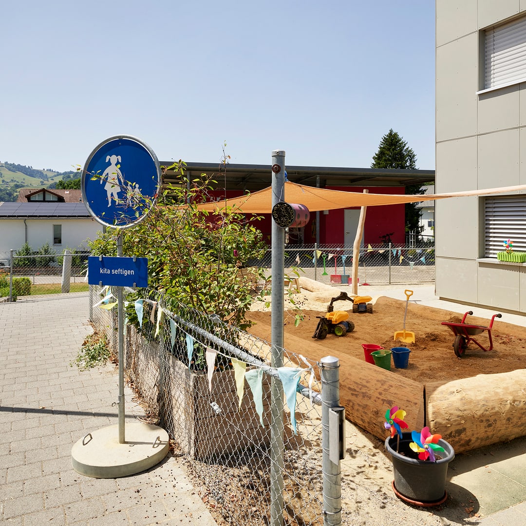 All das befindet sich in unmittelbarer Nähe der Kita Seftigen. Seit Mai 2020 bewohnt die Kita – zusammen mit der Tagesschule – den eigens für Kinder ausgebauten Standort. Auf zwei Stockwerken stehen der Kita lichtdurchflutete und freundliche Räume zu Verfügung. Es gibt viel Platz für Bewegung, ein Bau- und ein Konstruktionszimmer, ein Malatelier und einen geschützten Kleinstkinderbereich. Im eigenen Garten mit Rasenfläche können die Kinder säen und selber ernten.